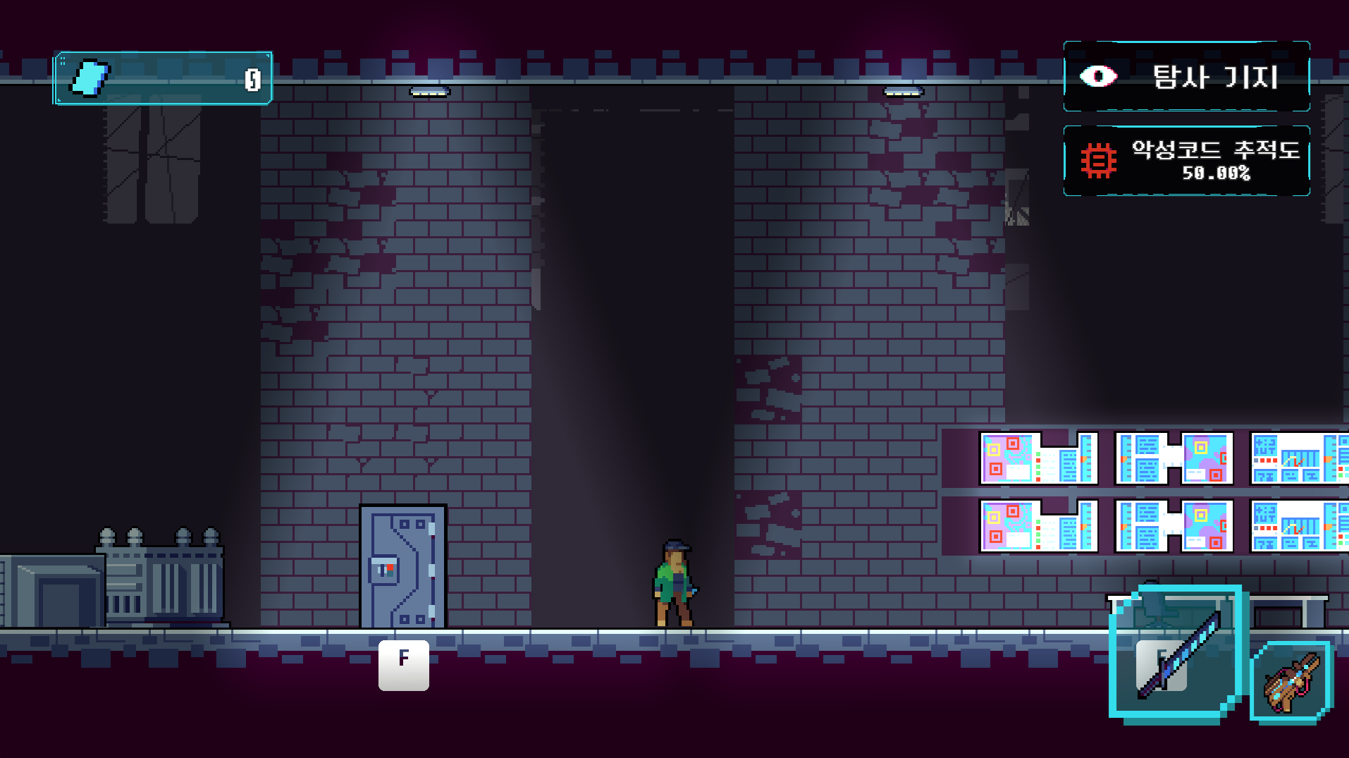 재밌게 플레이했습니다! 근접 무기 이용 시 마우스 커서 위치에 따라 방향 조정이 세부적으로 가능하면 더 좋을 것 같네요. 해킹 능력이 꽤 다양한 점이 좋았습니다